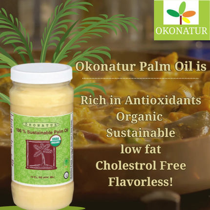 Okonatur Extra Virgin Organic Palm Oil comes from the fruit of the tropical palm tree Elaeis Guineensis which provides valuable free-radical protection for the cardiovascular and immune systems. Red Palm Oil contains more antioxidants and vitamin E than any other oil. Helps to reduce LDL, cholesterol and triglycerides. Use for healthier cooking. Okonatur unrefined red palm oil has a mild carrot-like flavor‚ with a rich‚ buttery texture. It's ideal for soups‚ sauces and sautéing. Certified kosher and part of RSPO.